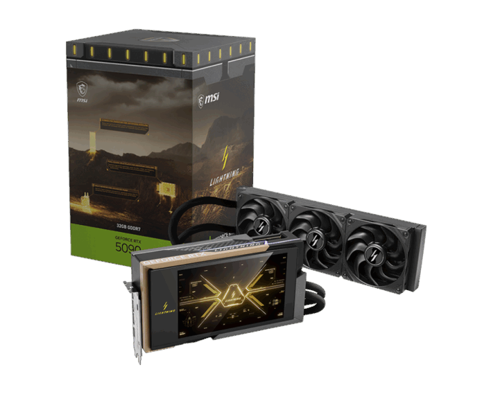 Construită pentru overclocking extrem și dezvoltată într-o nouă clasă de design cu răcire lichidă, aceasta combină un cold plate cu acoperire integrală cu o pompă de înaltă presiune de ultimă generație, arhitectură termică exclusivă MSI Lightning Fan, elemente din fibră de carbon turnate cu precizie, detalii impresionante și control software de ultimă generație, formând o expresie singulară a perfecțiunii performanței.