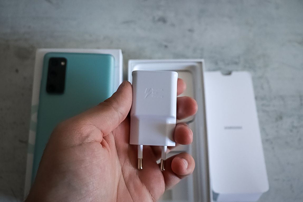 Samsung Galaxy S20 FE 5G vine într-o cutie albă, cu inscripția „S20” pe partea superioară, în culoarea telefonului. Ambalajul are și o textură plăcută, care este formată din inscripții ce fac referire la modurile de fotografiere pe care acest telefon le poate oferi.