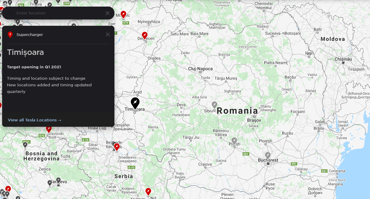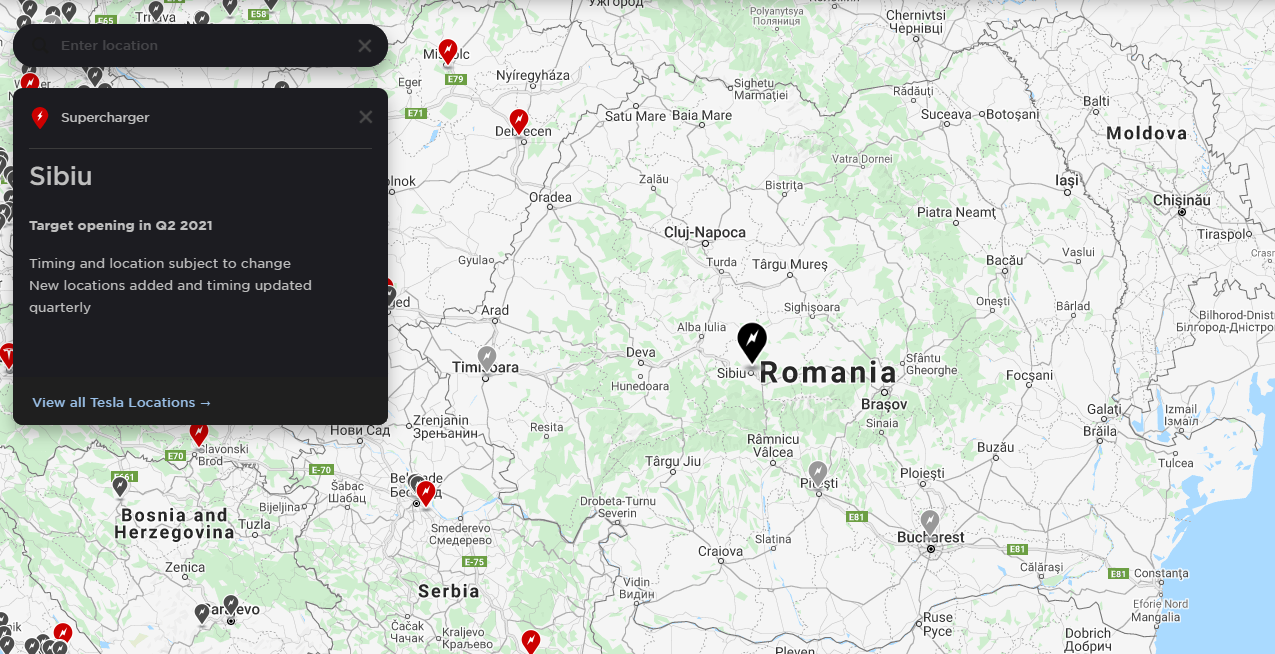 Dacă analizăm bine hărțile, Tesla propune deschiderea primei stații de încărcare din România până la finalul primului trimestru al anului 2021. Mai apoi, compania va începe să aducă Supercharger și în alte orașe precum București, Plitești și Sibiu.